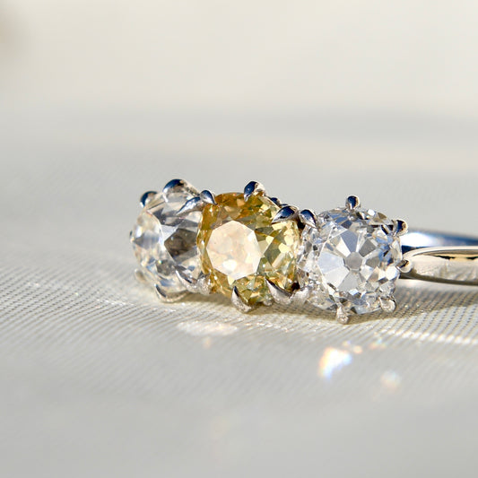 2.66 ct old mine cut diamond three stone ring