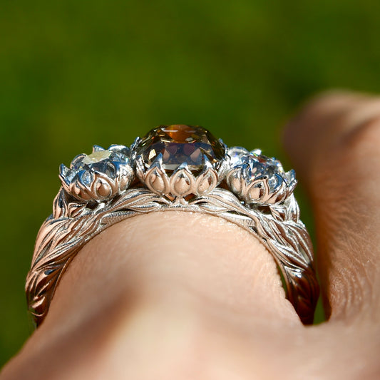 2.97 ct old mine and old European cut diamond tulip three stone ring