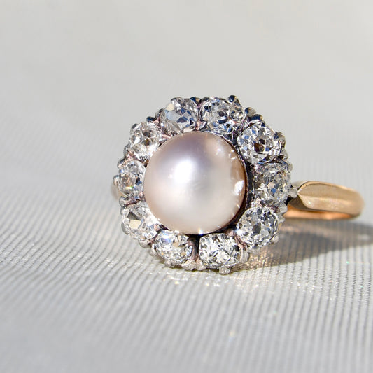 Antique natural pearl and 1.30 ct old mine cut diamond daisy ring