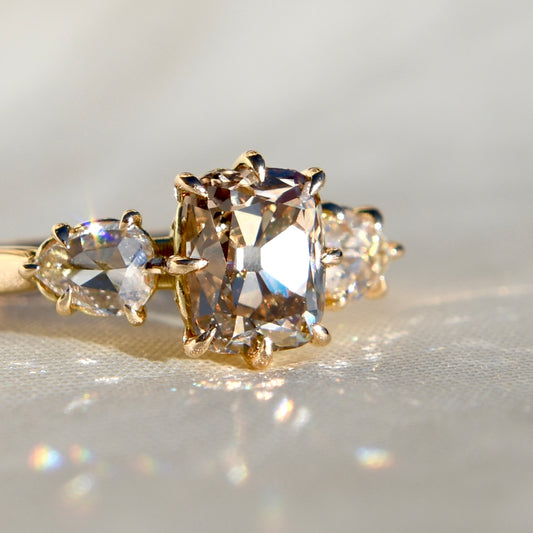 1.50 ct old mine cut diamond three stone ring